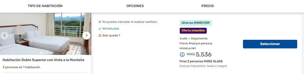 NOTA: Deberás seleccionar el precio de todo incluido en la página del proveedor.
