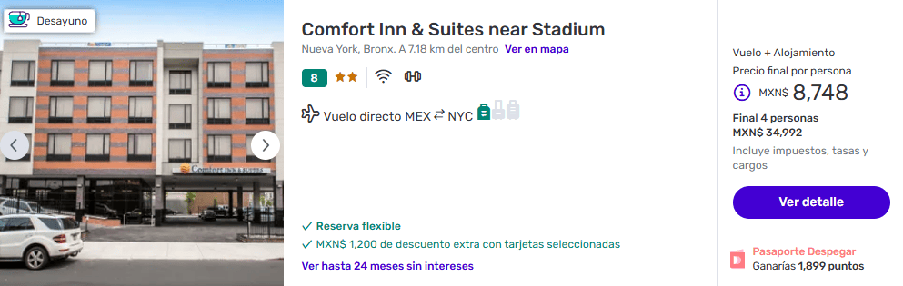 Chequen esta oferta de paquete a Nueva York con vuelos, hospedaje y desayunos incluidos, Se hospedarán en Comfort Inn & Suites near Stadium, durante 5 días/ 4 noches, se encuentra en El Bronx, el establecimiento está a 2,5 km del estadio Yankee y a 6 km del zoológico del Bronx, y una excelente ubicación en Manhattan.